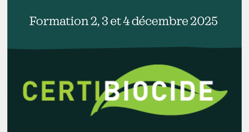 Certibiocide Nuisibles24/11/2025Venez vous mettre en conformité en suivant la formation Certibiocides nuisibles sur 3 jours : 2, 3 et 4 décembre 2025